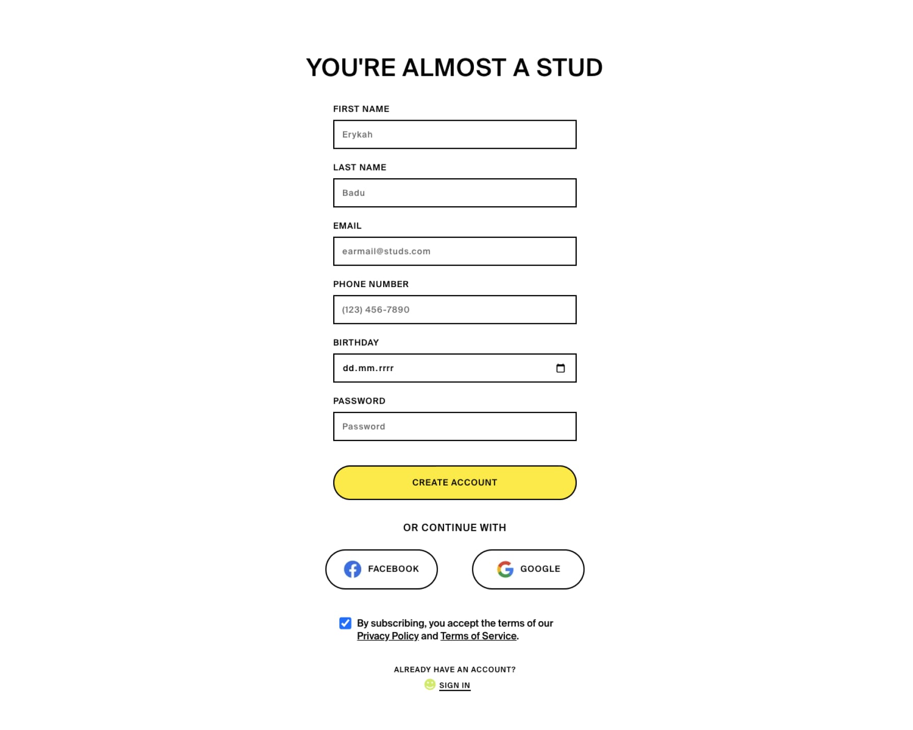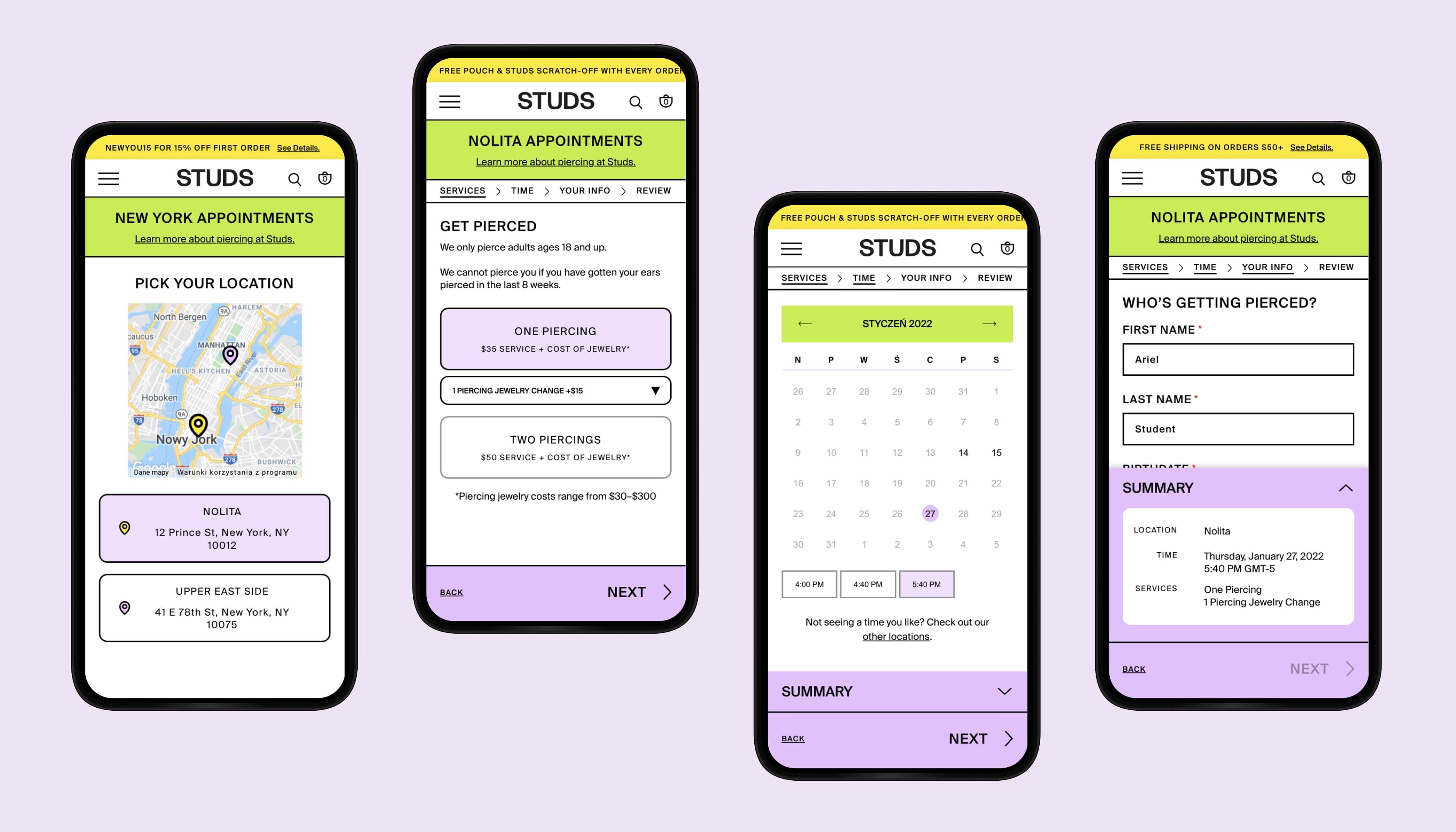 In addition to our work on Studs' omnichannel commerce experience, we worked closely with the team to optimize the journey of booking a piercing and transform it from bland to branded.