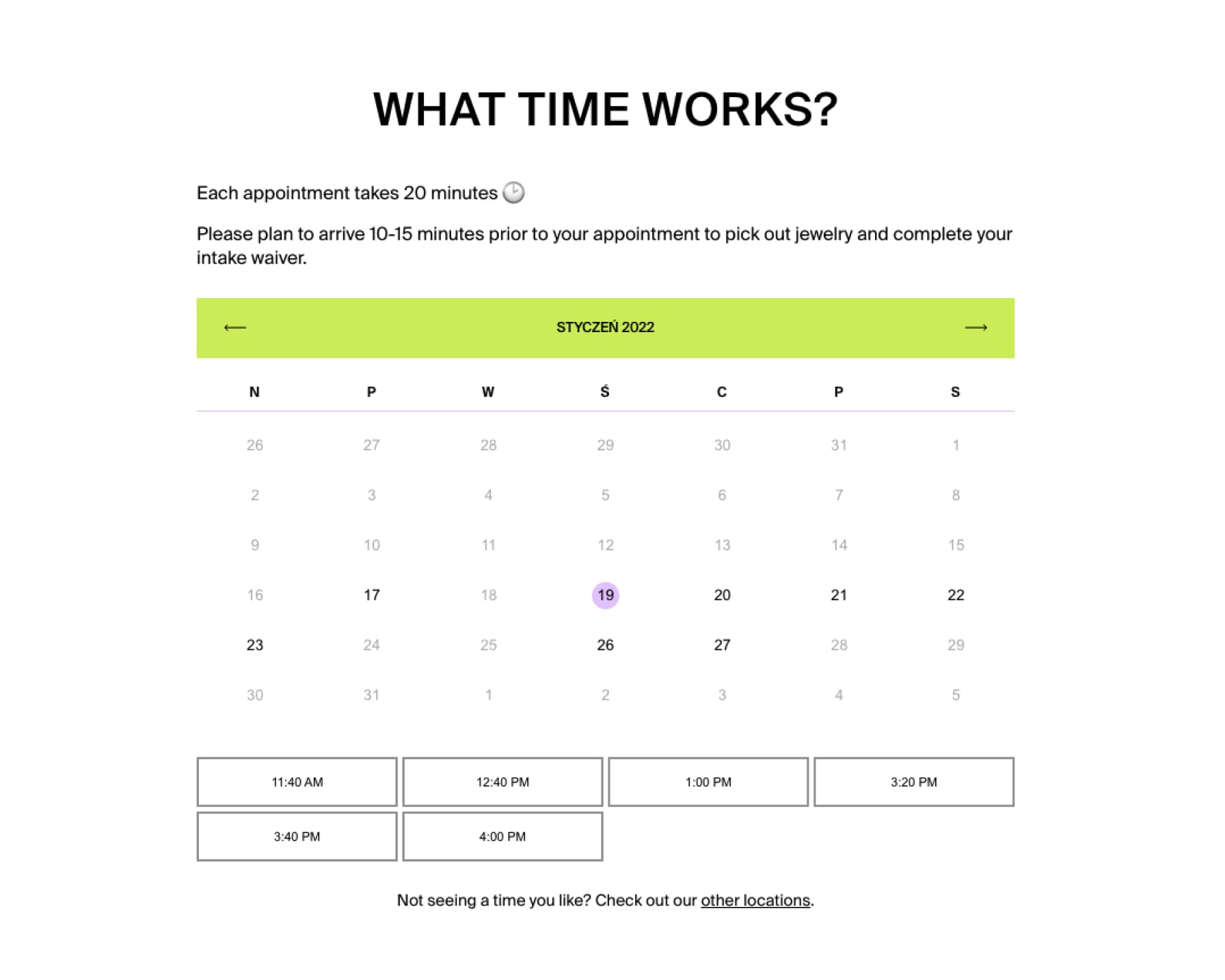 Before we got to work, when customers wanted to book piercing appointments, they had to choose a Studs studio and select a date; if that date didn’t have availability, the customer was out of luck.
