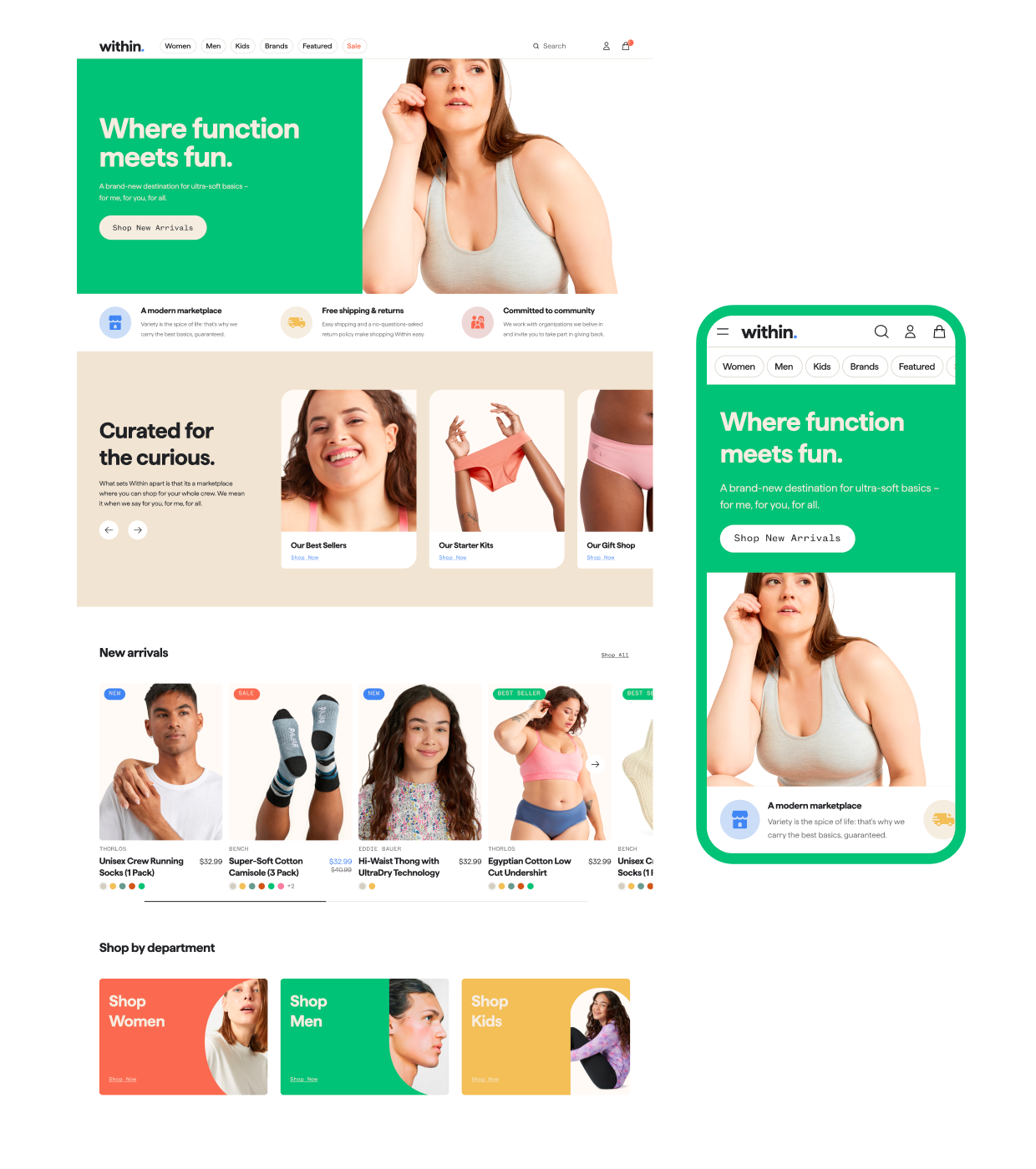 In addition to their namesake brand, Within carries more than 12 high-quality brands for basics including Bench, Thorlos, Trimfit and more. We worked with the team at Within to create a website that would allow the brand's distinct personality to shine through while highlighting a portfolio of brands for folks of all ages, shapes and sizes.
